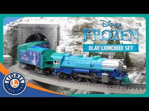 Climb aboard for a frozen adventure with Disney's Olaf and Sven on our Disney Frozen Olaf train set! This whimsical set is decorated in icy blue colors and graphics of two beloved pals, Olaf and Sven, from Disney's Frozen as they have fun in the snow! Included in this set is a LionChief steam locomotive and tender, boxcar, bobbing car with Olaf and Sven peeking out as the train goes around, caboose, and all the track and power you need to get your train up and running! © Disney